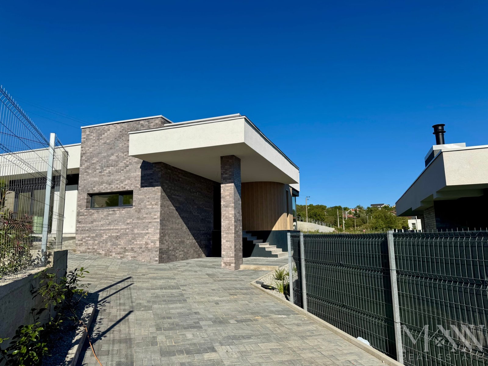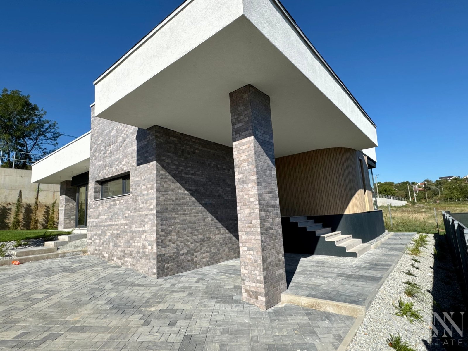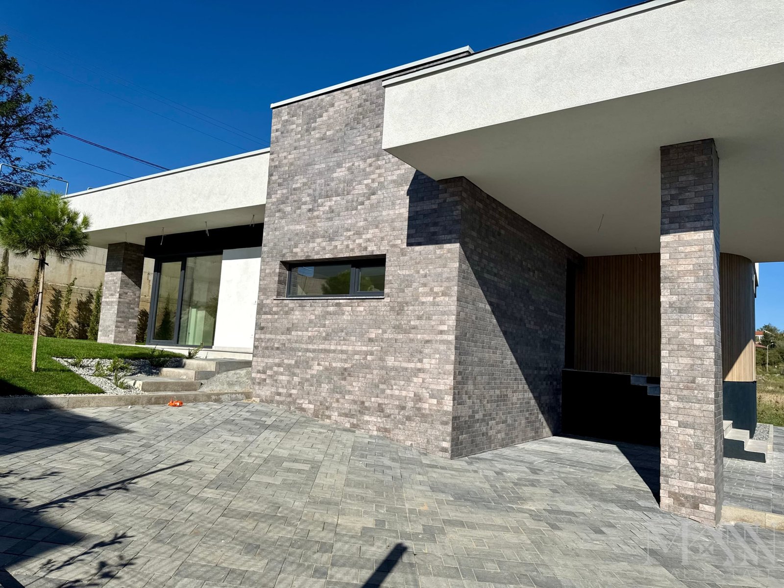 - Finisaje exterioare de inalta calitate: tencuială decorativă, placaje din piatră naturală și riflaje cu texturi ce imită lemnul, oferind un design unic și sofisticat.