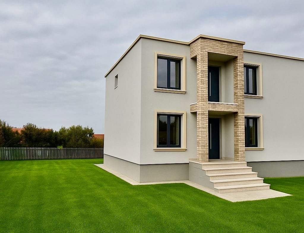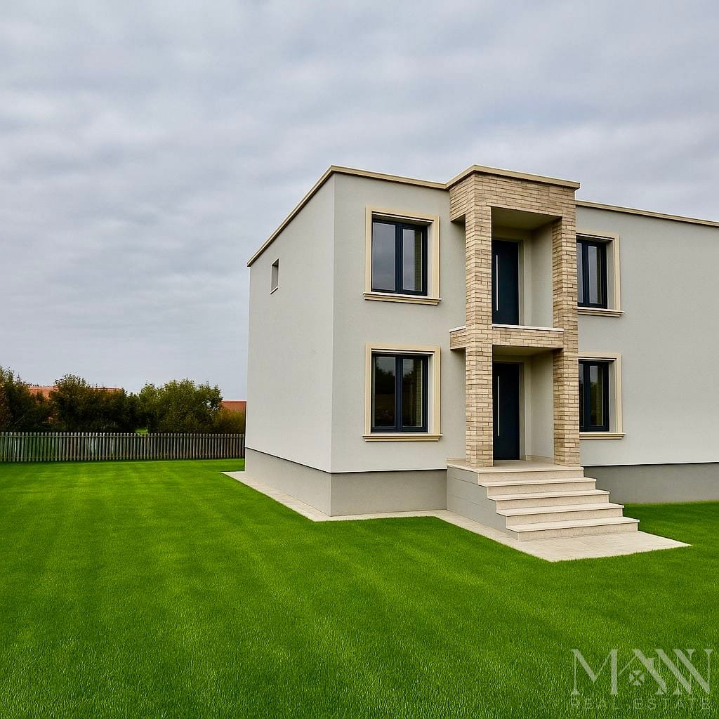 Casa este in regim duplex: pe fundatie comuna dar cu pereti independenti si o zona comuna delimitata. Stil de constructie modern, cu acces individual si intimitate sporita intre unitati.