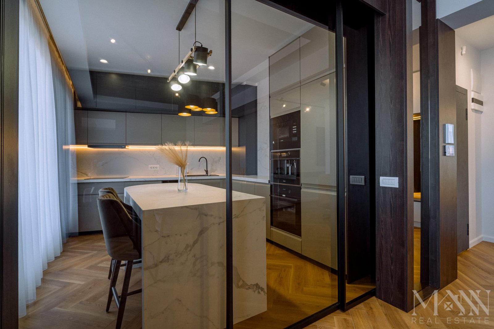 • Bucătărie modernă, discret separată vizual prin perete glisant din sticla securizată;